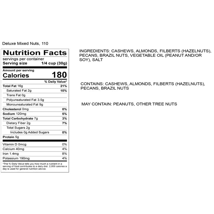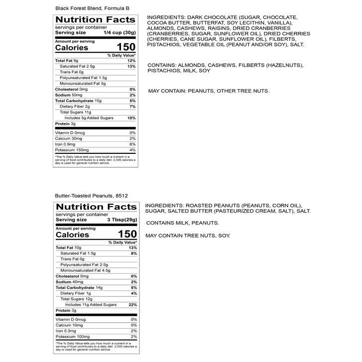 - 12 oz. Mammoth Pecans - Roasted and Salted ,14 oz. Roasted & Salted Cashews ,14 oz. Roasted & Salted Deluxe Mixed Nuts ,14 oz. Black Forest Blend ,12 oz. Dark Chocolate Caramel Caps ,14 oz. Milk Chocolate Mini Toffee Bites ,16 oz. Butter Toffee Peanuts ,16 oz. Country Club Mix ,16 oz. Crunchy Sweet & Savory