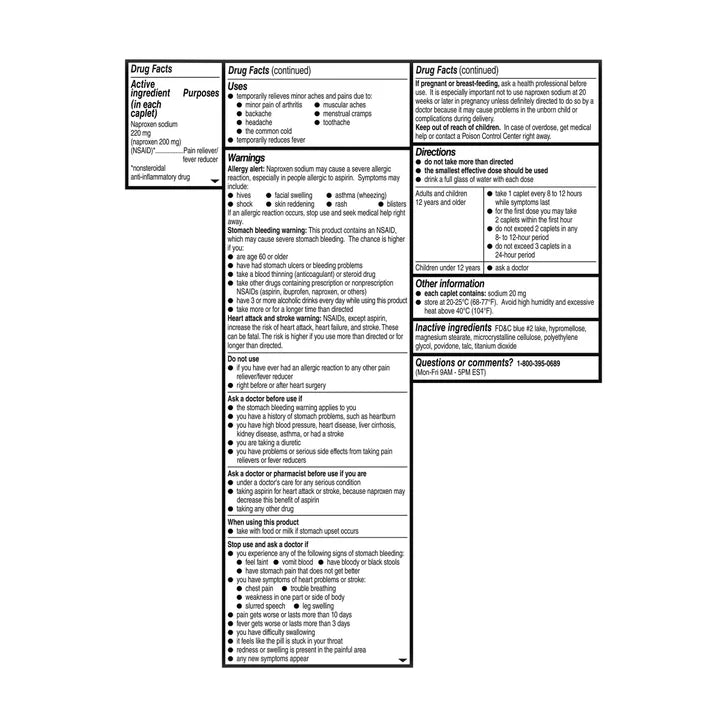 - Over-the-Counter Nonsteroidal Anti-Inflammatory Drug (NSAID),Naproxen Sodium 220 mg. Pain Reliever/Fever Reducer,Temporary Relief of Minor Aches and Pains, Including Minor Arthritis, Muscular Aches, Joint Pain and Menstrual Pain,Just two Caplets for up to 12 Hours of Relief