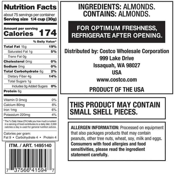 - Almonds,Kosher,Refrigerate after opening for optimum freshness,5 lb bag,Product of the USA