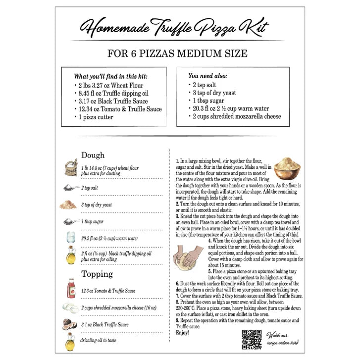 - Made in Italy,100g Wheat Flour,90g Black Truffle Sauce,8.45 oz. Black Truffle Flavored Dipping Oil,350g Black Truffle and Tomato Sauce,Pizza Cutter