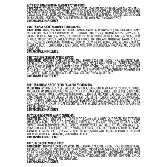 - 5-Lay's Sour Cream & Onion (1-1/2 oz bag),5-Doritos Spicy Nacho (1-3/4 oz bag),6-Cheetos Puffs (1-3/8 oz bag),5-Ruffles Cheddar & Sour Cream (1-1/2 oz bag),5-Fritos Chili Cheese (2 oz bag),4-Funyuns Onion Flavored Rings (1-1/4 oz bag)