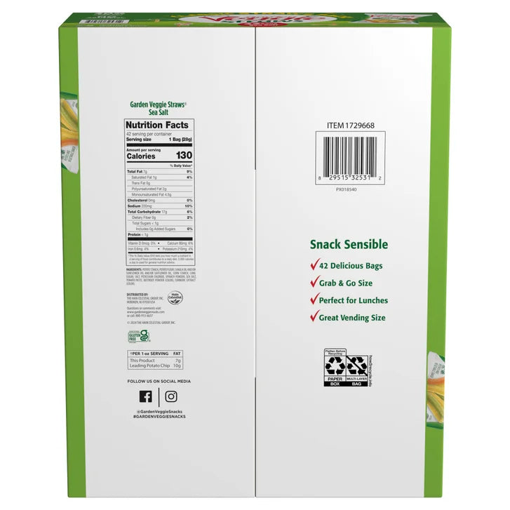 - No artificial flavors or preservatives,Gluten free,Kosher,Individually packaged for resale,Net Weight 42 oz,Garden Veggie Straws,Sea salt,Straw shaped sensible snack,Delicious taste of potatoes, tomatoes and spinach topped with sea salt,Perfect for vending machines, lunches or a grab and go snack,1 oz bag,42 count
