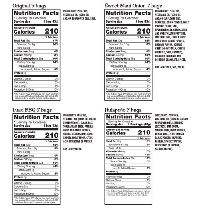 - Variety pack: 9-Hawaiian Original, 7-Sweet Maui Onion, 7-Luau BBQ, 7-Hulapeno