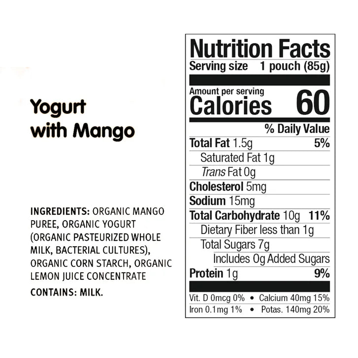 - 40 Total 3 oz. Pouches,10 Pouches - Blueberries, Apple & Banana,10 Pouches - Mango,20 Pouches - Apple, Banana & Berries,USDA Organic, Non-GMO & from regenerative farming,Grass-Fed Dairy,Good source of calcium,0g of added sugar,Shelf-stable,Resealable pouch for easy on-the-go snacking,Yogurt with Apple, Banana & Berries: Organic Yogurt (Organic Pasteurized Whole Milk, Bacterial Cultures), Organic Apple Puree, Organic Banana Puree, Organic Strawberry Puree, Organic Blackberry Puree, Organic Red Currant Puree, Organic Corn Starch, Organic Lemon Juice Concentrate,Yogurt with Blueberries, Apple & Banana: Organic Yogurt (Organic Pasteurized Whole Milk, Bacterial Cultures), Organic Blueberry Puree, Organic Apple Puree, Organic Banana Puree, Organic Corn Starch, Organic Lemon Juice Concentrate,Yogurt with Mango: Organic Mango Puree, Organic Yogurt (Organic Pasteurized Whole Milk, Bacterial Cultures), Organic Corn Starch, Organic Lemon Juice Concentrate,Directions: Squeeze into a bowl or onto a spoon or serve straight from the pouch! ,Storage: Store in a cool dark place. ,Refrigerate after opening and serve within 24 hours.,CONTAINS MILK.,Contains 40 individual 3oz pouches,Produced in Spain,For babies 8 months and up