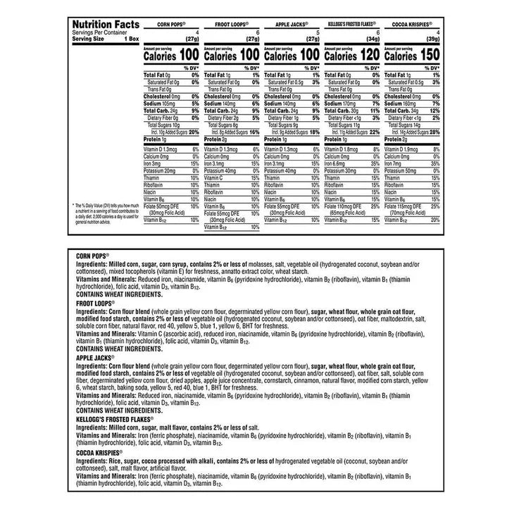 - Breakfast, snack time, on-the-go,4-Corn Pops, 6-Froot Loops, 5-Apple Jacks, 6-Frosted Flakes, 4-Cocoa Krispies