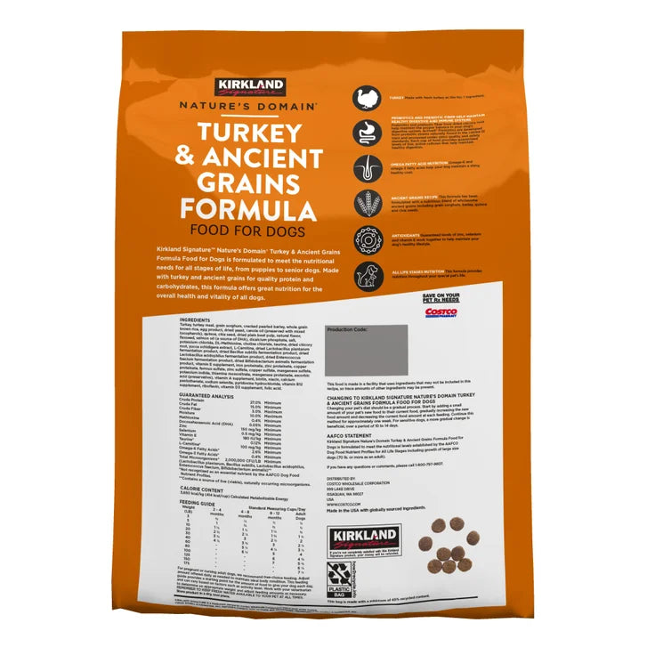 - Replacing Item # 1538725 KS Nature's Domain Turkey and Ancient Grains 35 lbs,First Ingredient Cage-Free Turkey,Probiotics and Prebiotic Fiber For Healthy Digestive and Immune Systems,Made with a Nutritious Blend of Wholesome Ancient Grains