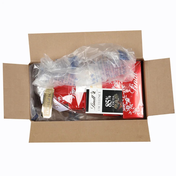 - ["1.68 oz. Lindt Lindor Double Chocolate Milk Chocolate Truffle Balls","2.52 oz. Lindt Lindor White Chocolate Truffle Balls","4.20 oz. Lindt Lindor Dark Chocolate Truffle Balls","3.50 oz. Lindt Lindor White Chocolate Truffle Bar","6.30 oz. Lindt Lindor Milk Chocolate Truffle Balls","3.50 oz. Lindt Bar Excellence Extra Dark 85%","5.10 oz. Lindt Lindor Assorted Truffle Balls","5-High Paper Box Tower with Lindt Design","Satin Ribbon with Gold Lindt Logo 1.5”]
