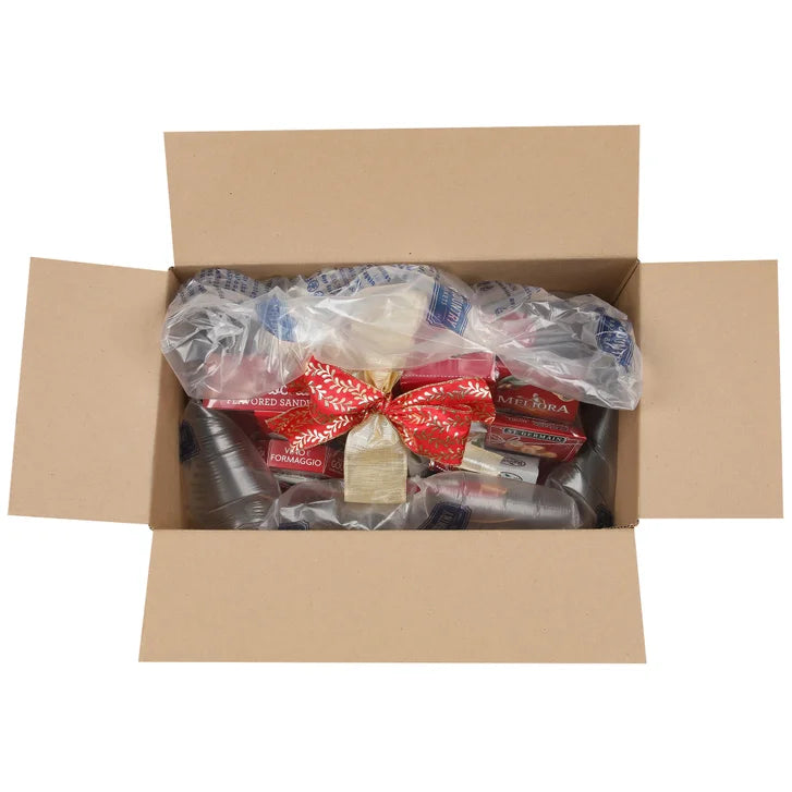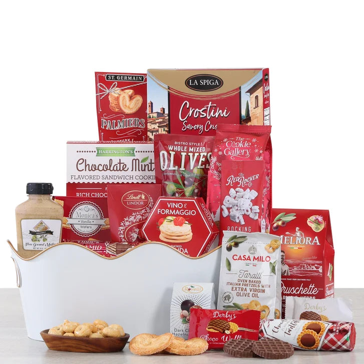 - 3.50 oz. Vino e Formaggio "Smoked Gouda" Cheese Spread,13.00 oz. Harrington’s Chocolate Mint Sandwich Cookies,7.05 oz. La Spiga Rosemary Crostini Savory Crisps,0.85 oz. Lindt Lindor Milk Chocolate Truffles,2.11 oz. Meliora Garlic & Herb Bruschette, and more,Get the Holiday party started with the Party Time Beverage Tub!,An abundance of sweet and savory treats like Rovelli Dark Chocolate with Hazelnut Praline, Monica’s Vanilla Wafers, Lindt Lindor Milk Chocolate Truffles, Hamilton House Tartlet Cookies with Chocolate Flavored Filling, Vino e Formaggio Smoked Gouda Cheese Spread, Meliora Garlic & Herb Bruschette, Napa Valley Stone Ground Mustard, and much more! Sure to impress anyone on your list! And after all the goodies have been enjoyed, the chic beverage tub is perfect for holiday parties! It really is the gift that keeps on giving,3.50 oz. Vino e Formaggio "Smoked Gouda" Cheese Spread (USA),13.00 oz. Harrington’s Chocolate Mint Sandwich Cookies (USA),7.05 oz. La Spiga Rosemary Crostini Savory Crisps (Italy),0.85 oz. Lindt Lindor Milk Chocolate Truffles (USA),2.11 oz. Meliora Garlic & Herb Bruschette (Italy),1.32 oz. Rovelli Dark Chocolate with Hazelnut Praline (Italy),1.27 oz. St. Germain Palmiers Pastry (Ukraine),3.50 oz. Bella Campagna Whole Mixed Olives (Peru),2.82 oz. Casa Milo Taralli Italian Pretzels with Olive Oil (Italy),7.05 oz. Cookie Gallery Spiced Waffle Cookies(Italy),0.78 oz. Derby’s Hazelnut Flavored Choco Waffle (Turkey),0.78 oz. Derby’s Strawberry Flavored Choco Waffle (Turkey),4.94 oz. Hamilton House Tartlet Cookies with Chocolate Flavored Filling (Brazil),0.88 oz. Liddy’s Confections Cocoa Coated Wafer (Turkey),2.75 oz. Monica's Vanilla Wafers (USA),9.00 oz. Napa Valley Stone Ground Mustard (USA),1.25 oz. The Red Rocker Rocking Chair Mix (USA),Metal Beverage Tub with Handles 16.5x8.5x5/6” (China),Sheer Metallic Ribbon 2.5”(Taiwan),Satin Ribbon 2.5” (Taiwan)