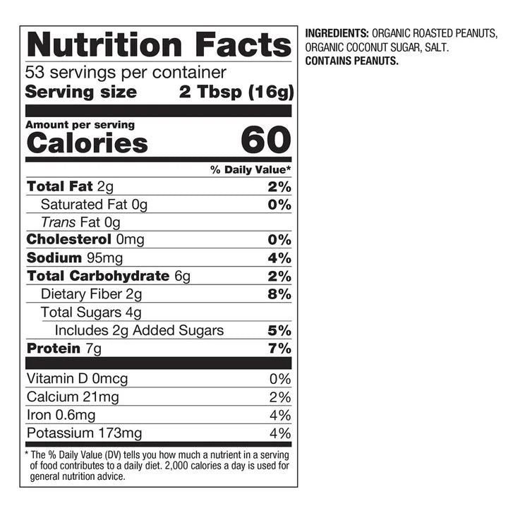- Resealable bag,USDA organic,Gluten free,Non GMO,Kosher,7g plant-based protein,87% less fat* than traditional peanut butter,1/3 the calories* of traditional peanut butter