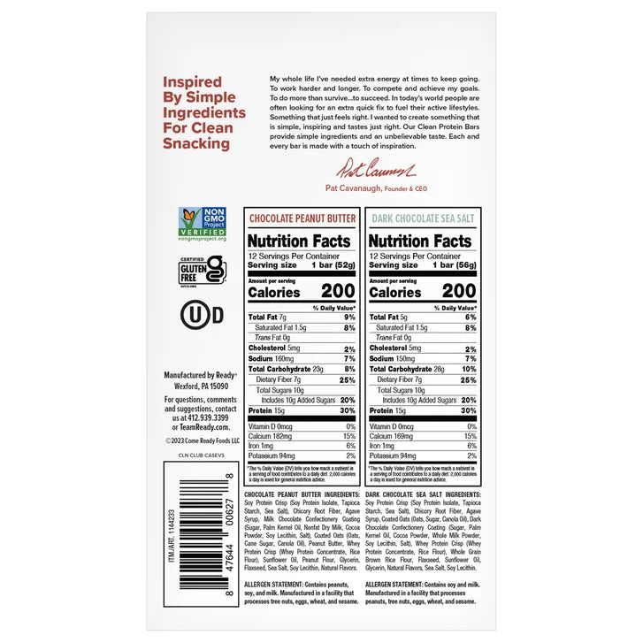 - 24 count,2-pack,Certified Gluten Free,Non GMO,Kosher,12-Chocolate Peanut Butter Protein Bars,12-Dark Chocolate Sea Salt Protein Bars,15g of Protein to help Muscle Recovery, Muscle Growth, and Muscle Repair.,A Great-Tasting Protein Bar with 7g of Fiber to satisfy cravings.,Nutrient-Rich Whole Grains.,Clean Nutrition that Works Just as Hard as You. Non-GMO.,A Protein Bar that Everyone can Enjoy: Certified Gluten-Free!