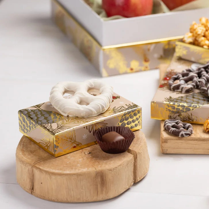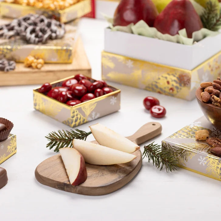 - 2 Royal Comice Pears,4 Red Anjou Pears,4 Fuji Apples,3.20 oz. Butter Rum Cashew Popcorn,3.00 oz. Roasted Salted Mixed Nuts, and more